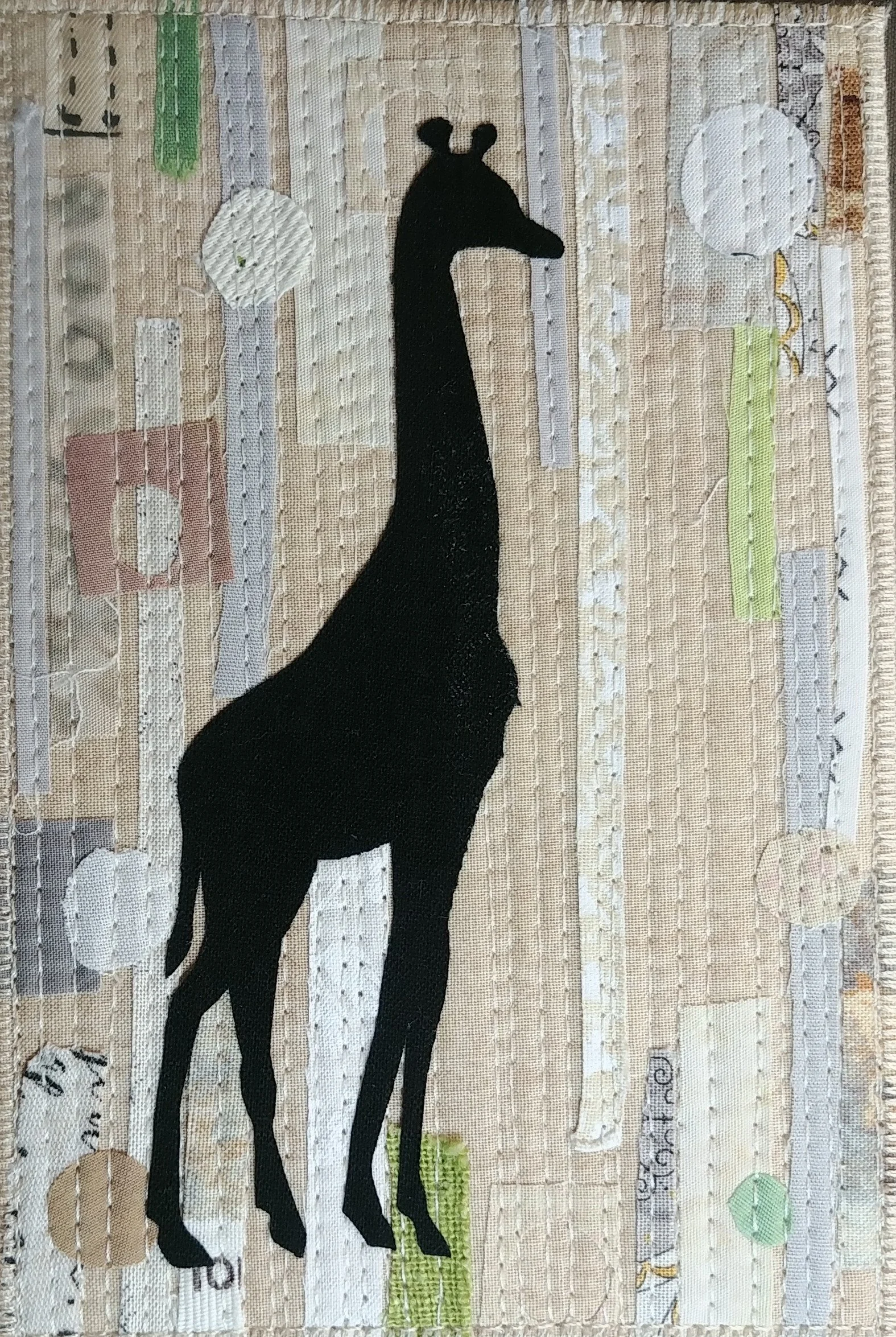 Backgrounds are whole cloth (like in the bleeding heart card) or raw edge collaged (pieced background in the giraffe card)