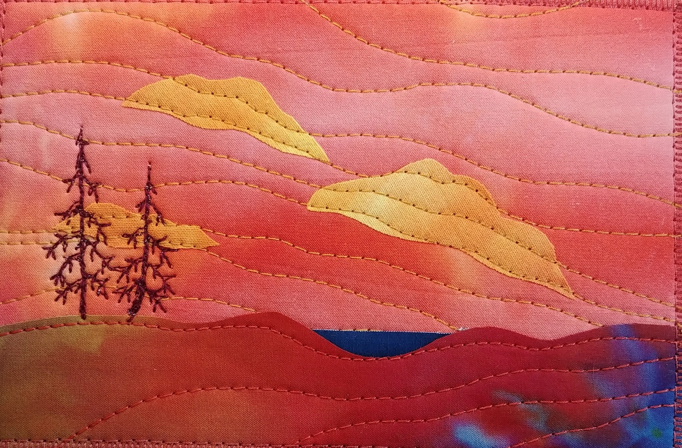 A 4”x6” piece of fiber art created using hand-dyed, hand-painted, and/or eco-dyed fabrics made by the artist using upcycled and manufactured cotton and linen fabrics